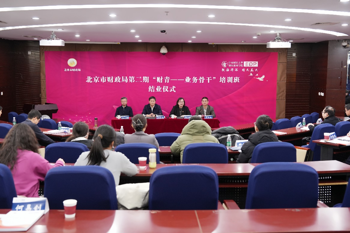 2026年1月18日上午,北京市财政局第二期“财青—业务骨干”培训班结业仪式在我校学院南路校区举办。北京市财政局党组成员、副局长关得志,中央财经大学党委副书记杨莹以及北京市财政局人事教育处处长毛昕等领导出席,中央财经大学继续教育学院院长蔡如海主持结业仪式。